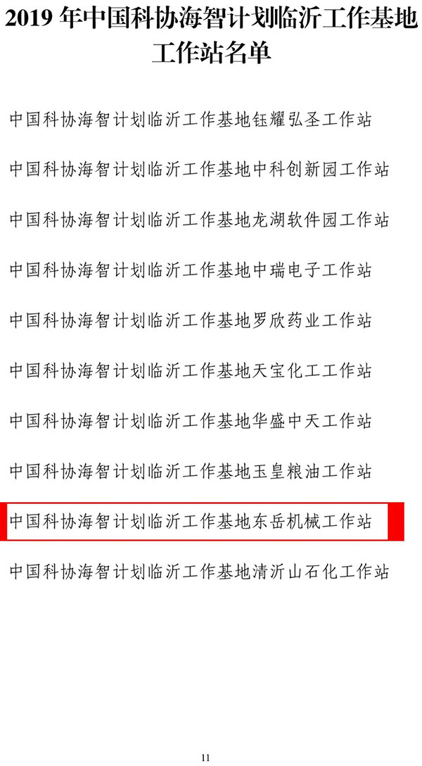 經(jīng)臨沂市科學(xué)技術(shù)協(xié)會批準(zhǔn)設(shè)立東岳機械為中國科學(xué)技術(shù)協(xié)會“海外智力為國服務(wù)行動計劃臨沂基地工作站”(簡稱海智計劃工作基地)。